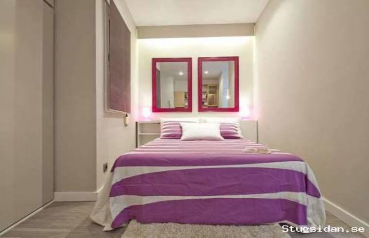 Den består av en dubbelsäng, en stor garderob och ett litet bord med stolar. Den