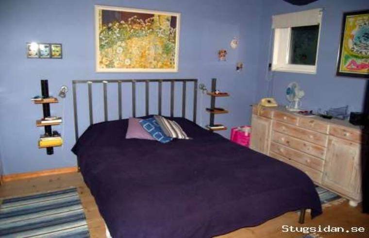 En gäststuga med dubbelsäng och i ett nybyggt hus nära