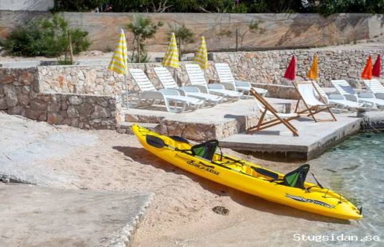 Småstenstrand framför huset med solstolar och parasoller. Stranden är