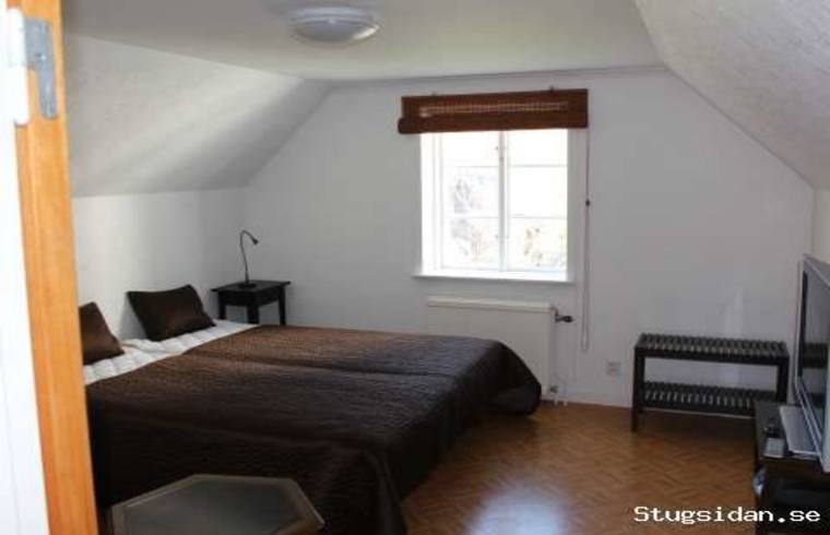 sovrum med dubbesäng. Plan 2 har ett kombinterat allrum/sovrum med två säng,