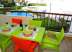 balkong med utsikt över poolen, möblerad med bord och stolar så att du kan äta ute.