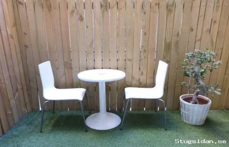 3 of these bedrooms have small table and 2 chairs. The living area is the center