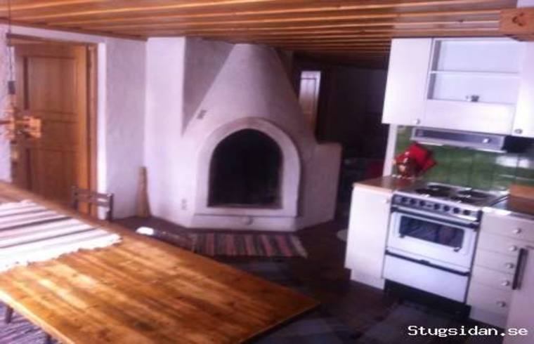 murad öppen spis, stor soffa +flera fåtöljer, köket har spis med ugn, fläkt,