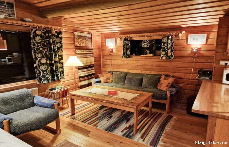 Stugan har allrum med öppen spis. Matrum och välutrustat kök med kyl/frys,