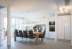 with a big dining table. The kitchen is equipped with oven, microwave,
