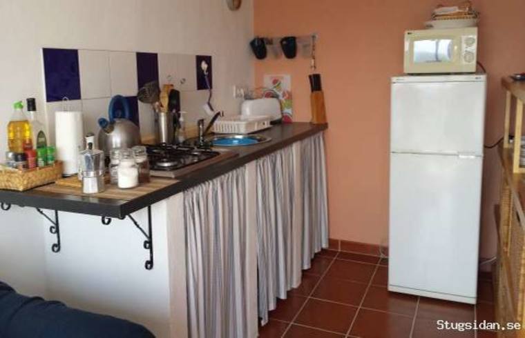 There is a cleverly planned Spanish influenced kitchen with a fridge