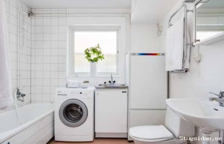 Rymligt bad med tvättmaskin, badkar, torkskåp och grovvask