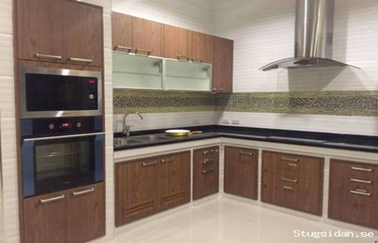 Modernt kök med induktionshäll, ugn, micro och kylskåp med