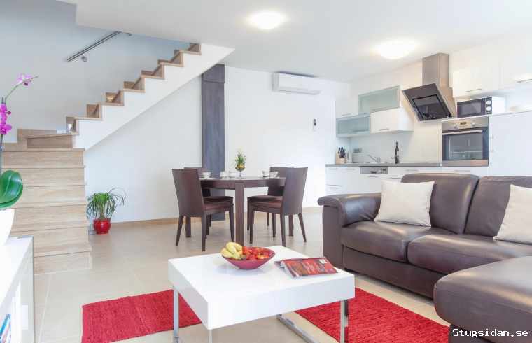 stentrappa leder till övervåningen. Två rum med moderna trämöbler har