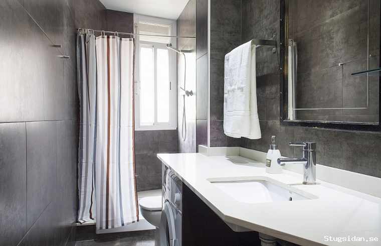 residence also comes with an full bathroom with a shower and elegant black tiles on the wall.