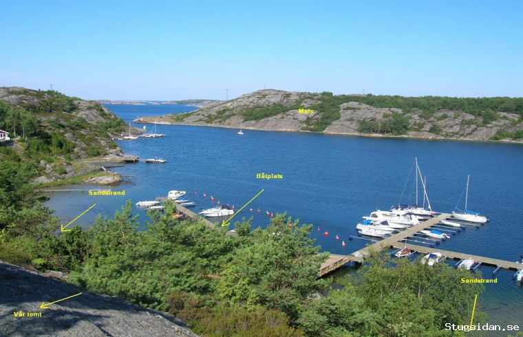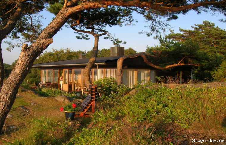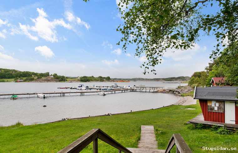 Stugan ligger på Orust vid Malö Strömmar med vidsträkt