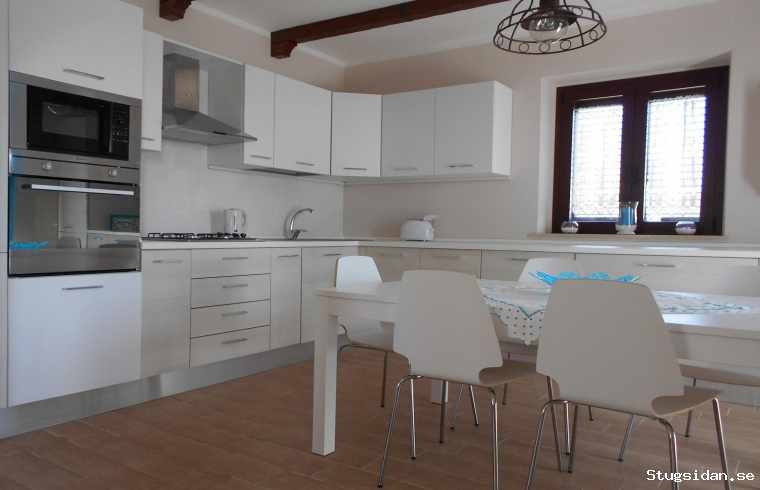 med matbord och sex stolar. Spis med fyra plattor(gas), ugn