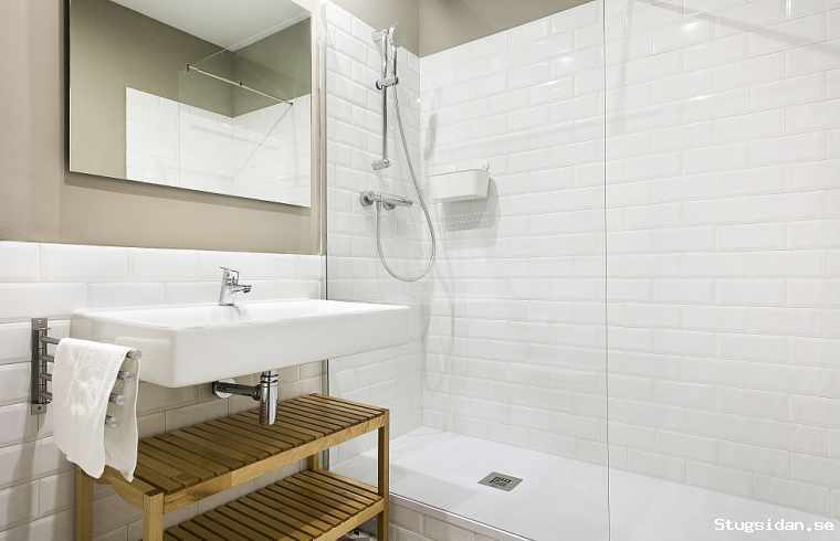 finns det badrummet, som har en nytt rent utseende, en dusch