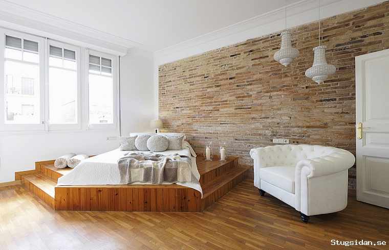 tegelvägg på ena sidan vilket är en vackert kontrast till de