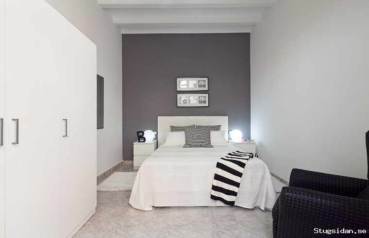 Det eleganta sovrummet är inrett i svartvitt färgschema,