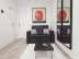 är inrett med en bekväm svart soffa, en TV och ett vitt
