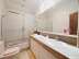 en stor spegel, fina lyktor samt abstrakt konst på väggen.