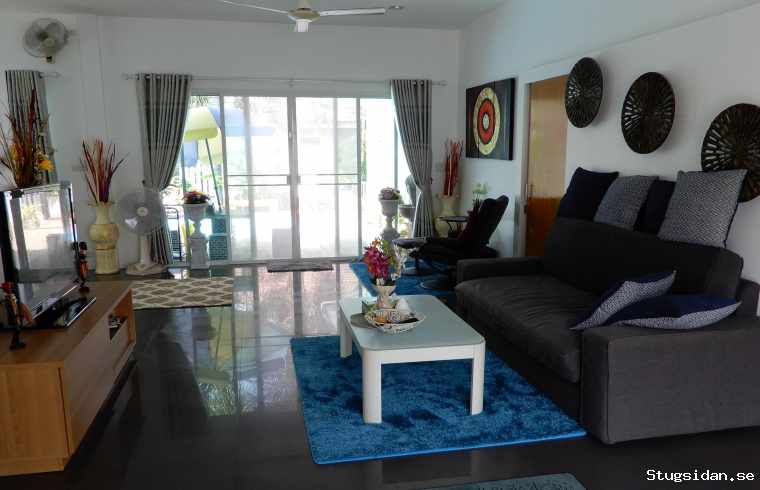 och en stor altan med swimmingpool. Den totala ytan är 80 kvm.