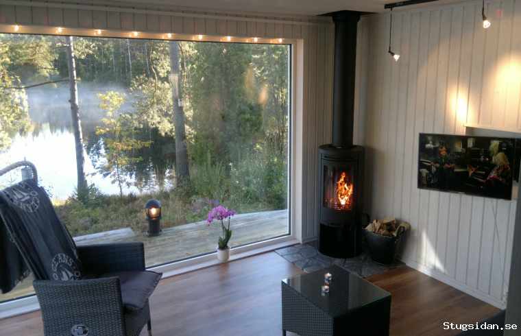 2 braskaminer, varav 1 braskamin är i det nybyggda sovrum / allrum med vikdörrar direkt till det byggda trädäcket vid sjön, och ett stort fönster mot sjön som vy.
