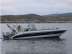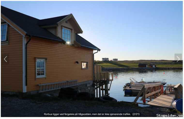 Rorbua "Noatun", stilfullt innredet i 2017, med hyrbåt liggende inntil verandaen.