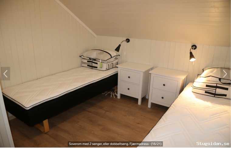 TV-stue i første etasje fungerer også som soverom for 1-2 personer. To soverom oppe, med 2 senger i ett, og 1 seng i det andre. Fjærmadrasser.