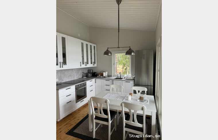 Stugan lämpar sig för 4 personer. Den är 65 m2 med öppet