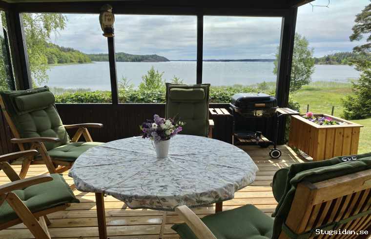 tak med trädgårdsmöbler, grill och havsutsikt. I stugan finns också en braskamin.
