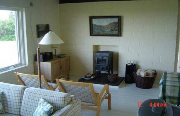 Opholdsstue med brændeovn og udgang til stor terrasse med havemøbler