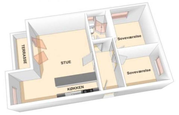 Selve lejligheden ligger på 4. sal (tagetagen), og er på 64 km2 med 2