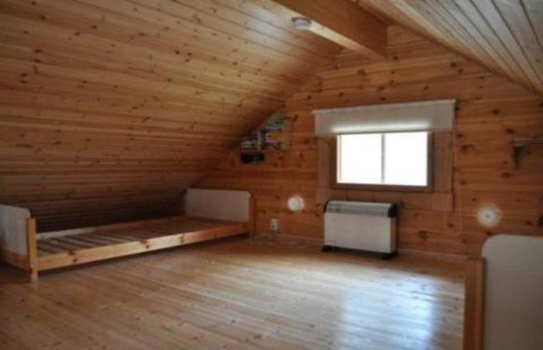 Övre plan: loft (12m2) med två sovplatser och skrivbord.