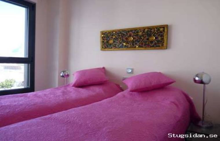 Ett har utsikt mot bergen. Ett av badrummen har dusch, det andra badkar. Bägge