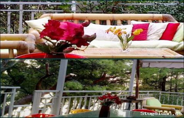 Stor terrass i grönska, matbord + stor bambu möbler, markis, grill