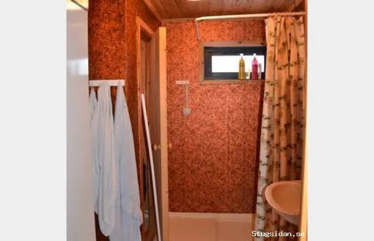 med bastu, torkskåp och dusch och tre sovrum med totalt 5 sängplatser. Det finns även en altan med söderläge.