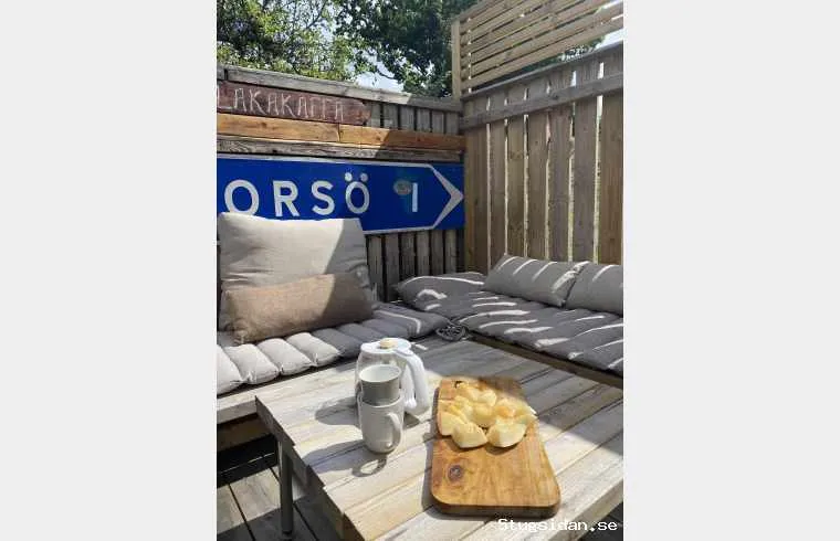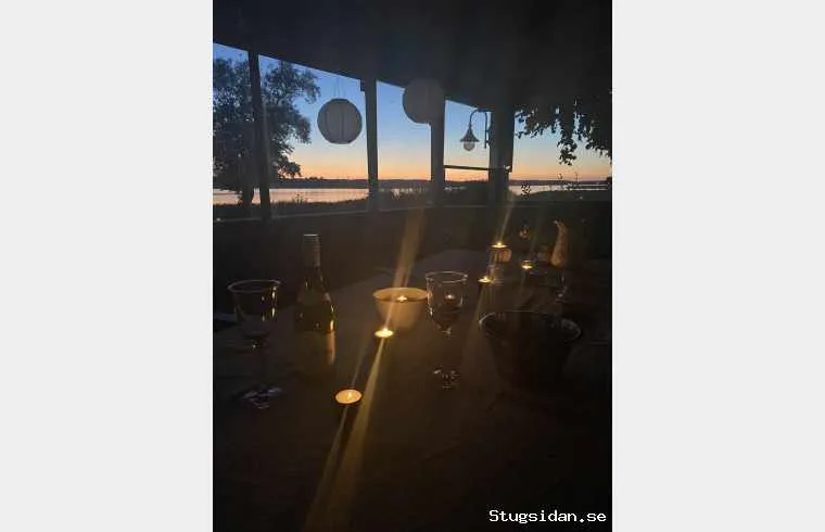 Stugan ligger invid Torsö på fastlandet, från E20 är det 9 km till
