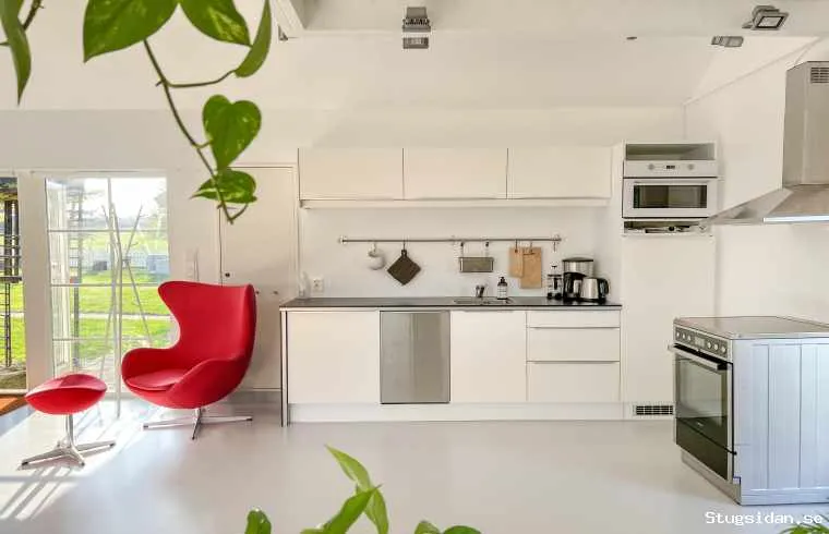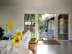 Grundstück. Große Glastüren und weiße Oberflächen sorgen für ein helles und