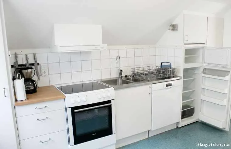 en bäddfåtölj. Kaklad WC/dusch och ett välutrustat kök med bl a diskmaskin,