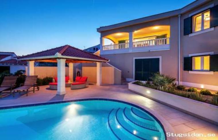 kan lätt sova i 4 sovrum. Huset har 4 badrum (3 badrum). Utanför poolen är