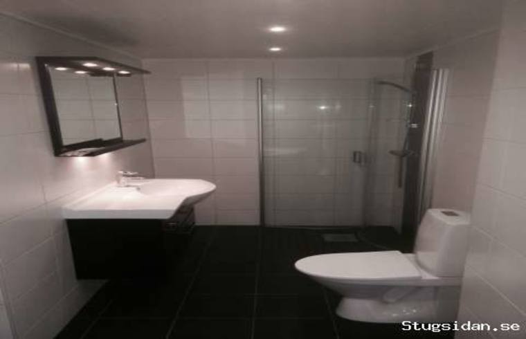 med dubbelsäng, hall, samt dusch och toalett. Båda
