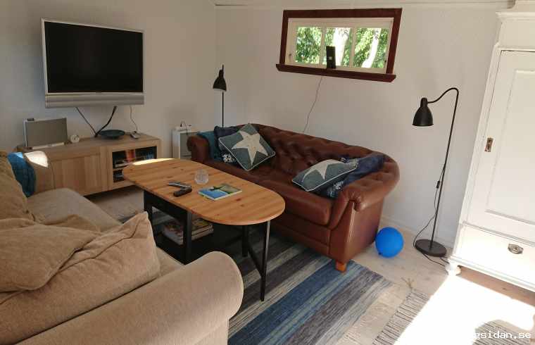 Gäststugan har ett kombinerat sov/allrum/pentry med TV, soffor