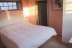 fjernsyn, cd og stereoanlæg, lyse vægge soveværelse med dobbeltseng og