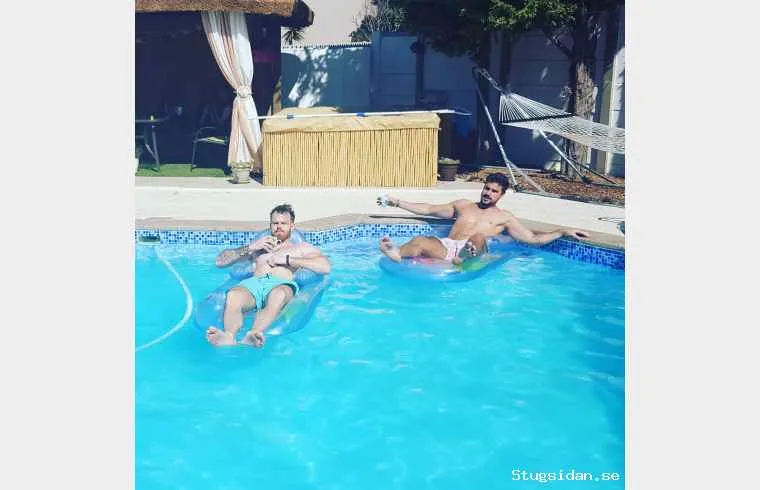 ingång och tillgång till den fina trädgården och poolen. Plats för 6 personer (2 dubbelsängar och en