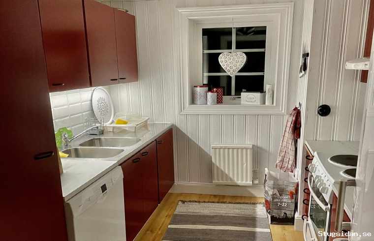 Välutrustat kök med kyl, frys och diskmaskin. Duschrum med