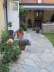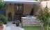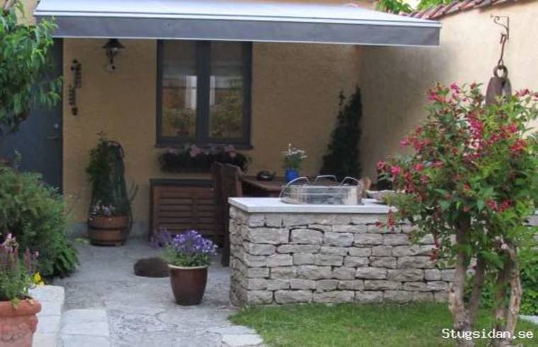 Liten mysig trädgård med inbyggd grill i kalkstensmur.