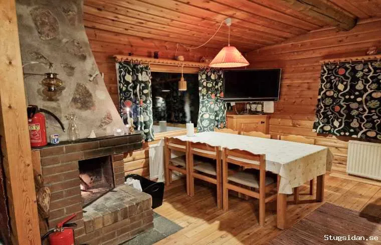 Stugan har allrum med öppen spis. Matrum och välutrustat kök med kyl/frys,