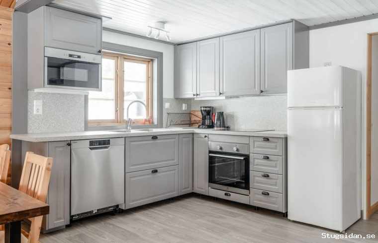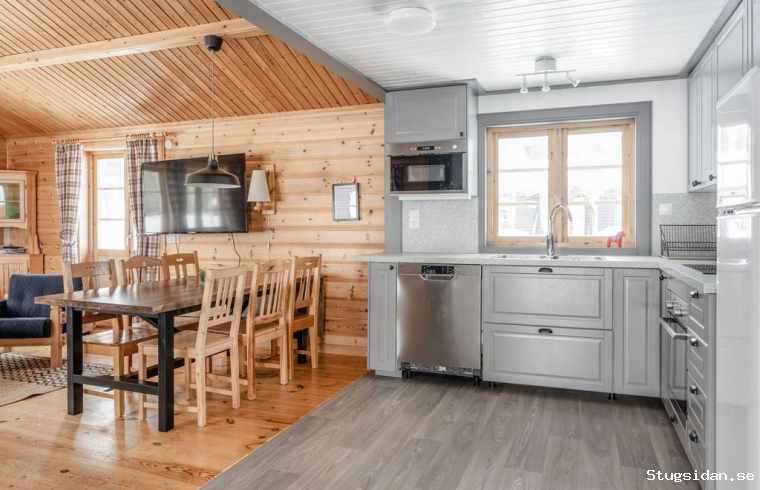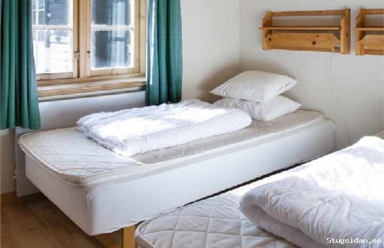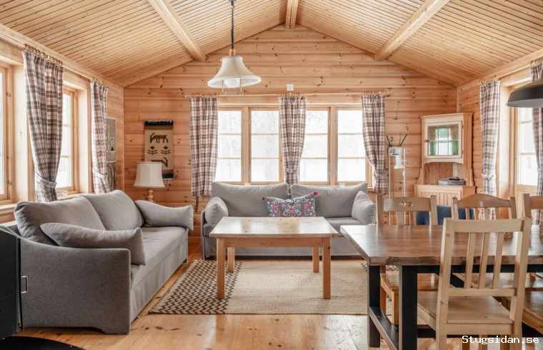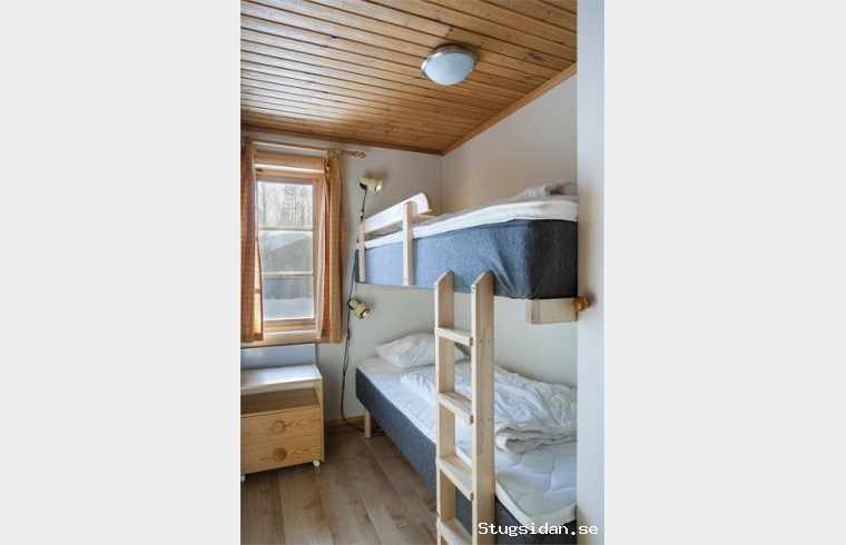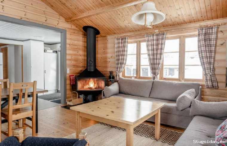 Stugan har allrum med braskamin, köksdel, 3 sovrum (1 dubbelsäng) +