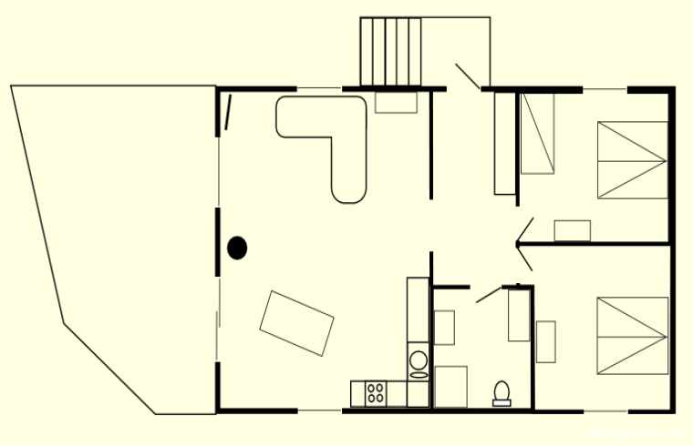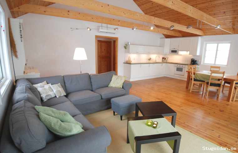 Vardagsrummet med kök och matplats är på 45 m² och till detta kommer två rymliga sovrum på vardera 15 m² samt ett stort badrum och en rymlig hall. I det ena sovrummet finns två sängplatser och i det andra tre. (Även bebissäng finns.)Alla