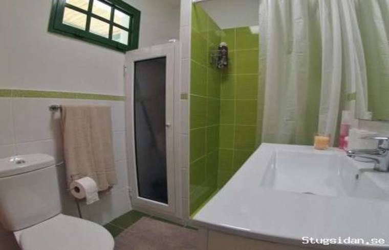 Badrum med dusch, toalett och hårtork, handdukar och tvål.