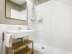 finns det badrummet, som har en nytt rent utseende, en dusch och skarpa vitt kakel.