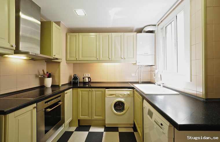 gröna skåp och svartvita rutiga golv, samt ett badrum med