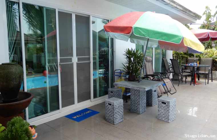 På altanen finns 3 sittgrupper med bord stolar, samt solstolar.